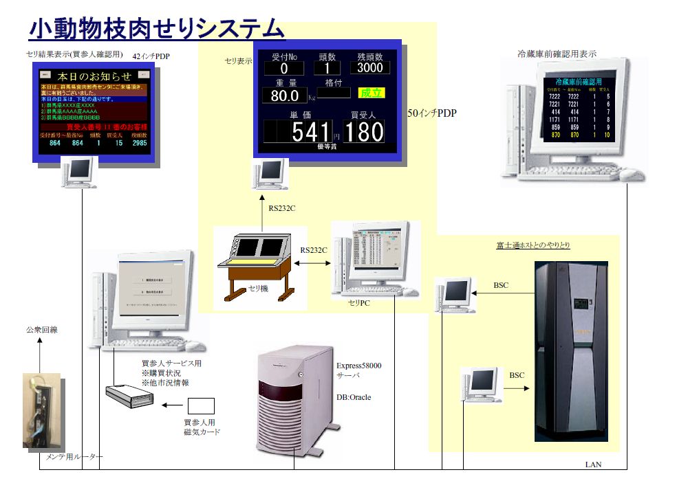 FTサーバ、耳標用ハンディターミナル、せり機(*1)、せり表示用50"プラズマディスプレイ(*1)